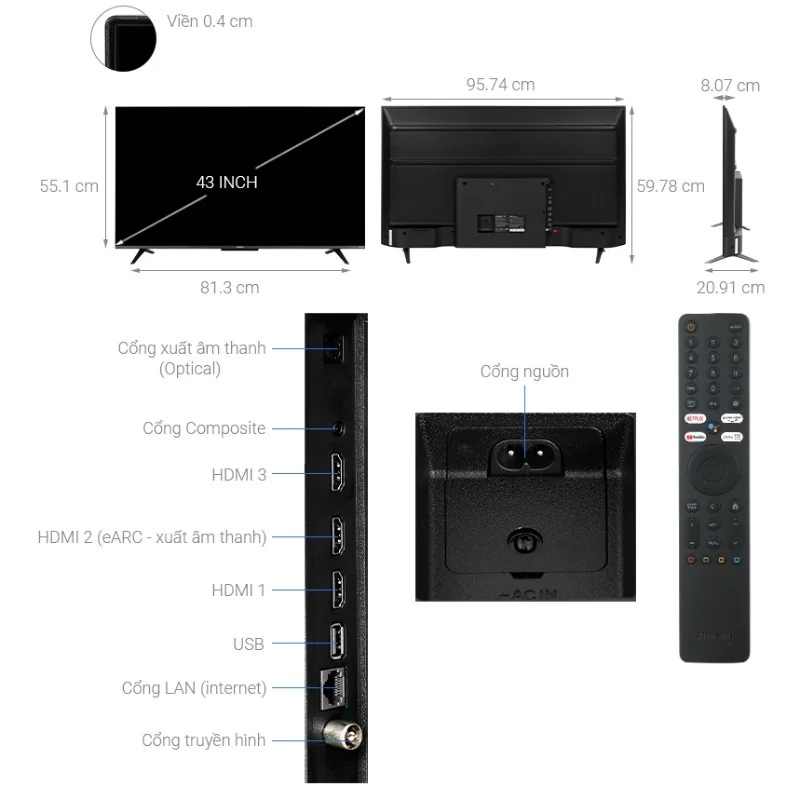 Ngoài ra, tivi còn hỗ trợ kết nối Bluetooth, cho phép bạn kết nối với các thiết bị âm thanh không dây như loa hoặc tai nghe, mang lại trải nghiệm nghe nhìn cá nhân hóa hơn. Cổng kết nối HDMI và USB đa dạng cũng cho phép bạn mở rộng khả năng sử dụng của tivi, từ việc kết nối với các thiết bị giải trí như máy chơi game đến việc xem các nội dung đa phương tiện từ ổ cứng ngoài.