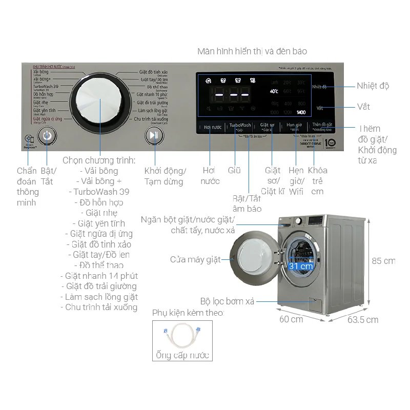 • TurboWash360: Rút ngắn thời gian giặt chỉ còn 39 phút nhờ hệ thống phun nước áp lực cao từ nhiều hướng, tăng hiệu quả làm sạch và tiết kiệm thời gian.
