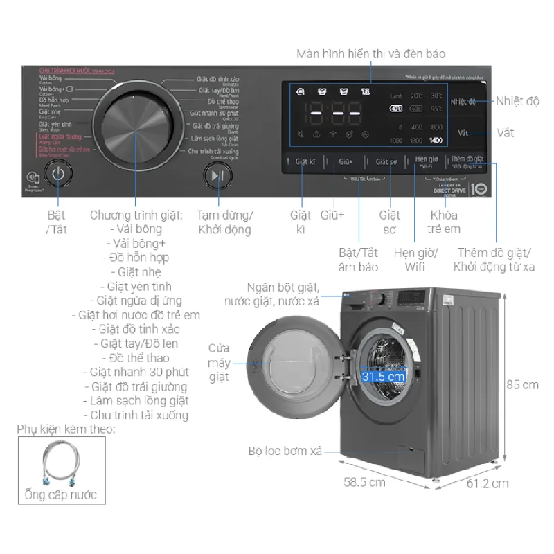 • Điều khiển từ xa qua ứng dụng LG ThinQ: Cho phép bạn điều khiển máy giặt mọi lúc, mọi nơi, tải thêm chương trình giặt và nhận thông báo khi máy gặp sự cố.