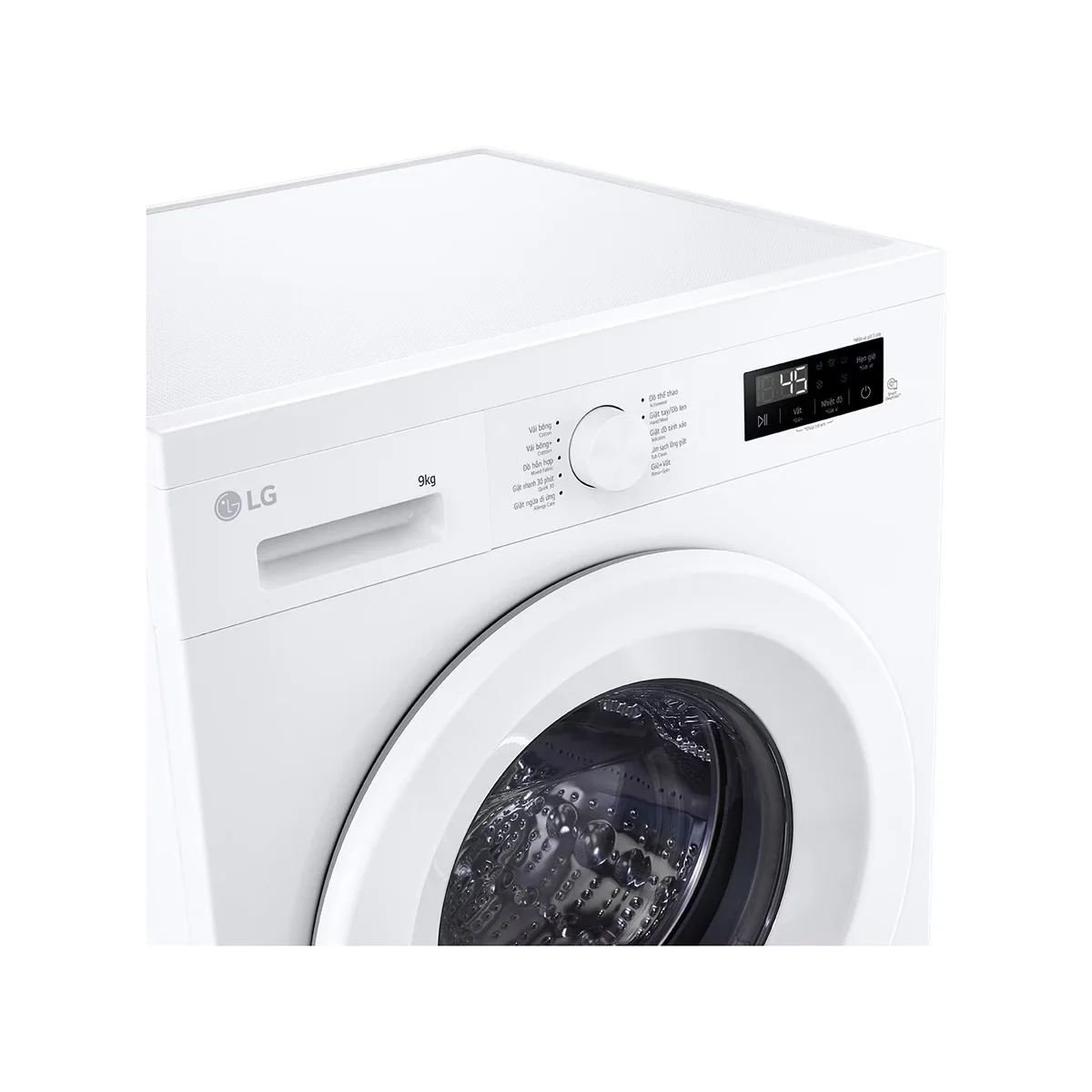 Bảng điều khiển song ngữ Anh – Việt với núm xoay, màn hình hiển thị và cảm ứng rõ ràng, giúp người dùng dễ dàng thao tác và theo dõi quá trình giặt.