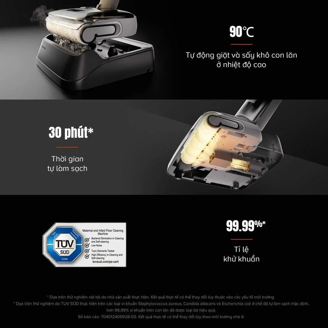 Roborock F25 RT vượt trội với tính năng giặt và sấy tự động ở 90°C, giúp con lăn luôn sạch khuẩn mà không cần vệ sinh thủ công. Nước nóng 90°C có khả năng loại bỏ 99,99% vi khuẩn, bụi bẩn và các tác nhân gây dị ứng. Nhờ đó, mọi mảng bám cứng đầu được xử lý hiệu quả mà không cần sử dụng hóa chất tẩy rửa, giúp bảo vệ an toàn cho trẻ nhỏ và người nhạy cảm.