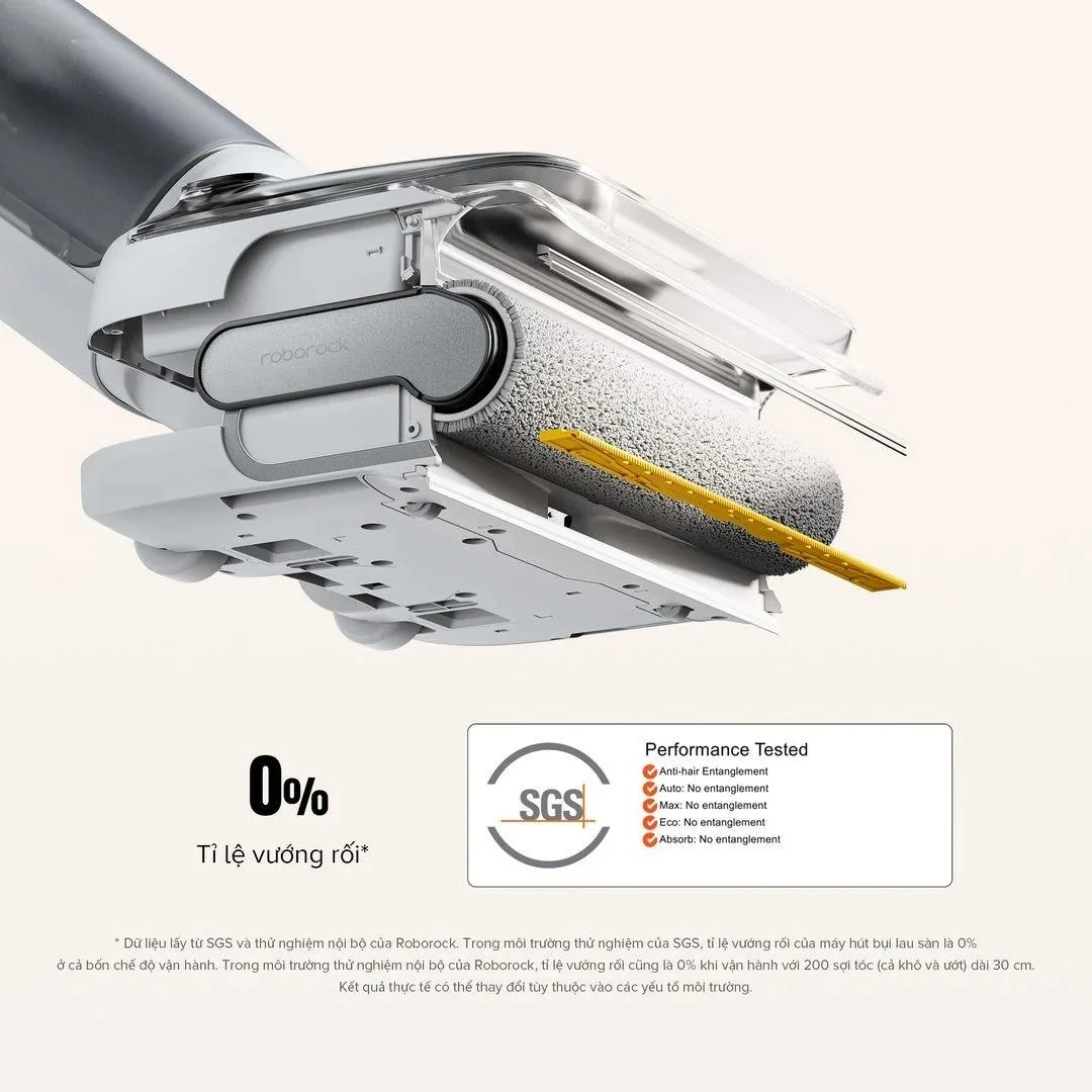 Bên cạnh đó, máy hút bụi cầm tay Roborock F25 RTT còn được tích hợp con lăn chống rối, ngăn chặn tình trạng tóc hay sợi vải cuốn vào đầu hút, giúp duy trì hiệu suất ổn định. Hệ thống phun 32 lỗ kết hợp với đầu bàn chải xoay 70° giúp loại bỏ vết bẩn cứng đầu, mang đến bề mặt sạch bóng mà không để lại vệt.
