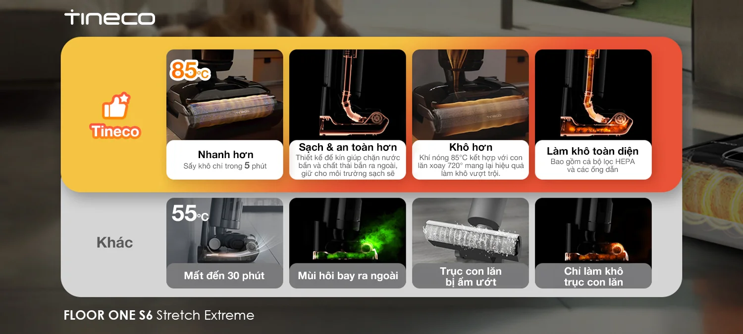Máy lau sàn khô ướt Tineco S6 Stretch Extreme trang bị hệ thống tự động làm sạch FlashDry
