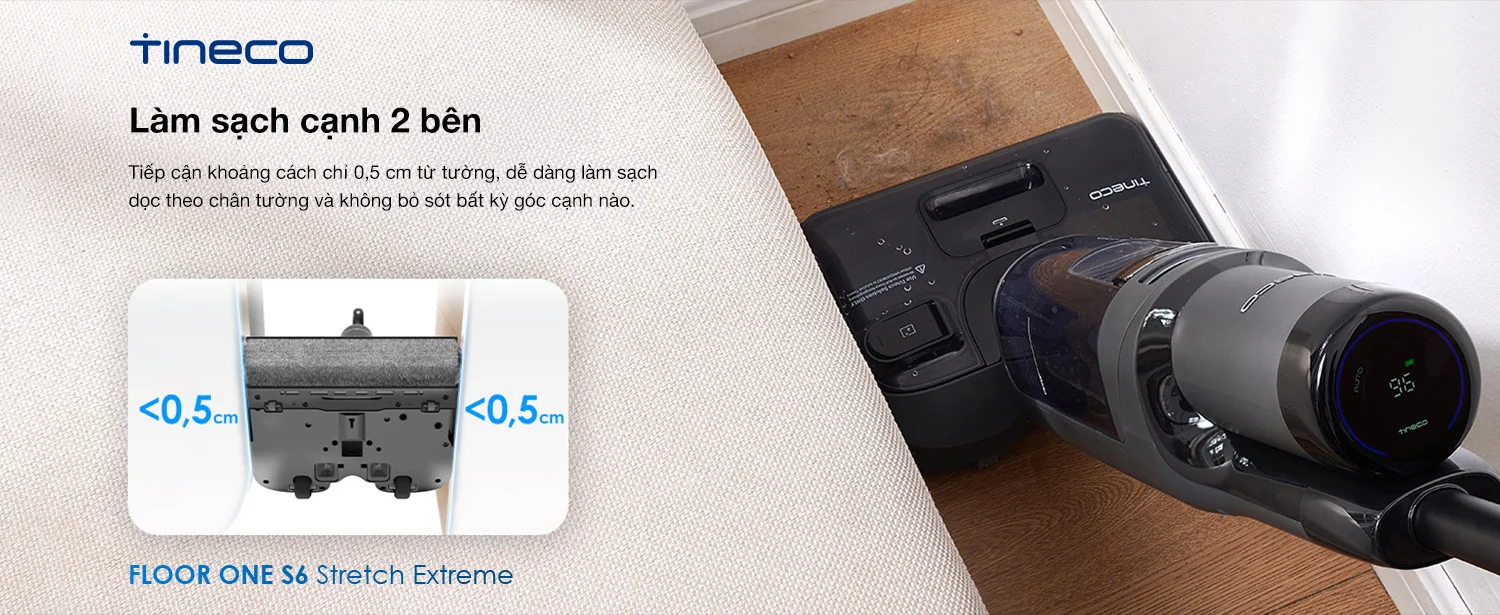 Với khả năng làm sạch cạnh đôi, máy hút bụi Tineco S6 Stretch Extreme dễ dàng xử lý các khu vực khó tiếp cận như chân tủ, xung quanh chân bàn hay dưới gầm tủ,… Tính năng này đảm bảo mọi ngóc ngách trong nhà bạn đều được làm sạch triệt để, không bỏ sót bất kỳ bụi bẩn nào.