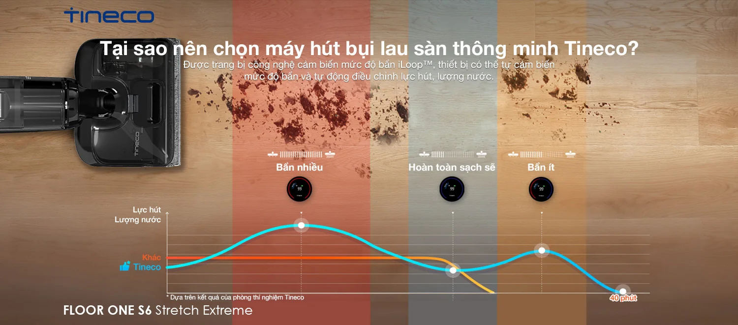 Cảm biến iLoop thông minh điều chỉnh lực hút và lượng nước theo thời gian thức, tối ưu hiệu suất pin. Pin dạng túi nén cải tiến cho phép máy hoạt động liên tục lên đến 40 phút, đảm bảo tuổi thọ bền bỉ, khả năng làm sạch không gián đoạn. Công nghệ Tineco MHCBS làm sạch con lăn liên tục với nước sạch và tái tạo nước bẩn hiệu quả, lực xoay 440 vòng/phút.