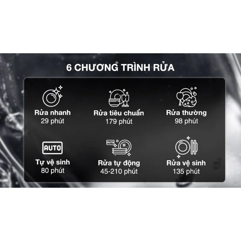 • Tích hợp 6 chương trình rửa được cài đặt sẵn bao gồm rửa nhanh, rửa tiêu chuẩn (tiết kiệm), rửa thường, tự vệ sinh, rửa tự động và rửa vệ sinh, cung cấp nhiều lựa chọn để bạn tùy chỉnh phù hợp với loại chất liệu, mức độ bẩn và nhu cầu làm sạch của bạn.