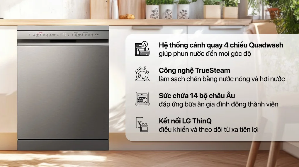 Máy rửa bát LG LDT14SVA4 là một sản phẩm cao cấp, thiết kế hiện đại, đáp ứng nhu cầu rửa bát cho gia đình từ 4-6 thành viên. Với công nghệ Inverter tiết kiệm điện năng, máy vận hành êm ái, hiệu quả. Chế độ rửa đa dạng, bao gồm rửa nhanh, rửa mạnh, và rửa tiết kiệm nước, phù hợp với mọi nhu cầu sử dụng. Đặc biệt, máy còn trang bị tính năng Wi-Fi, cho phép điều khiển từ xa qua ứng dụng trên điện thoại thông minh, mang lại sự tiện lợi tối đa cho người sử dụng.