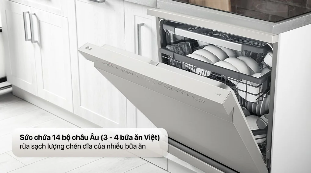 – Máy rửa bát độc lập LG LDT14SVA4 thiết kế gồm 3 dàn rửa trên – giữa và dưới, với sức chứa tối đa 14 bộ bộ đồ ăn, là lựa chọn lý tưởng cho gia đình có 4-6 thành viên. Đây là một trong những mức dung tích lớn nhất trên dòng máy rửa chén gia đình, với khoang rửa rộng rãi cho phép rửa được lượng lớn bát đĩa, đồ dùng trong mỗi lần rửa mà không cần phải chia nhỏ nhiều lần.