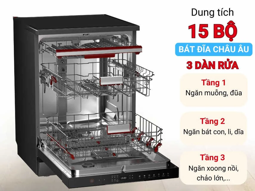 Với hệ thống giàn rửa trên, máy có thể rửa lên đến 15 bộ đồ ăn châu Âu (tương đương 3 – 4 bữa ăn Việt), phù hợp với gia đình 4–7 người. Khả năng rửa sạch nhiều chén bát, xoong nồi trong một lần vận hành giúp tiết kiệm thời gian, công sức và năng lượng tiêu thụ, mang đến sự tiện nghi và tối ưu hiệu quả sử dụng cho các hộ gia đình hiện đại.