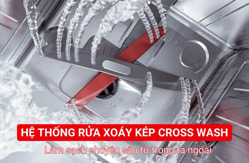 – Hệ thống rửa xoáy kép Cross Wash với thiết kế hai tay phun xoay ngược chiều và 15 tia phun mạnh mẽ tạo phạm vi phun rộng 720°, giúp làm sạch chuyên sâu từ trong ra ngoài, ngay cả với khối lượng chén bát lớn. Công nghệ này tối ưu hiệu quả làm sạch, loại bỏ cặn bẩn cứng đầu, đồng thời tiết kiệm thời gian và nâng cao hiệu quả sử dụng cho gia đình đông thành viên.