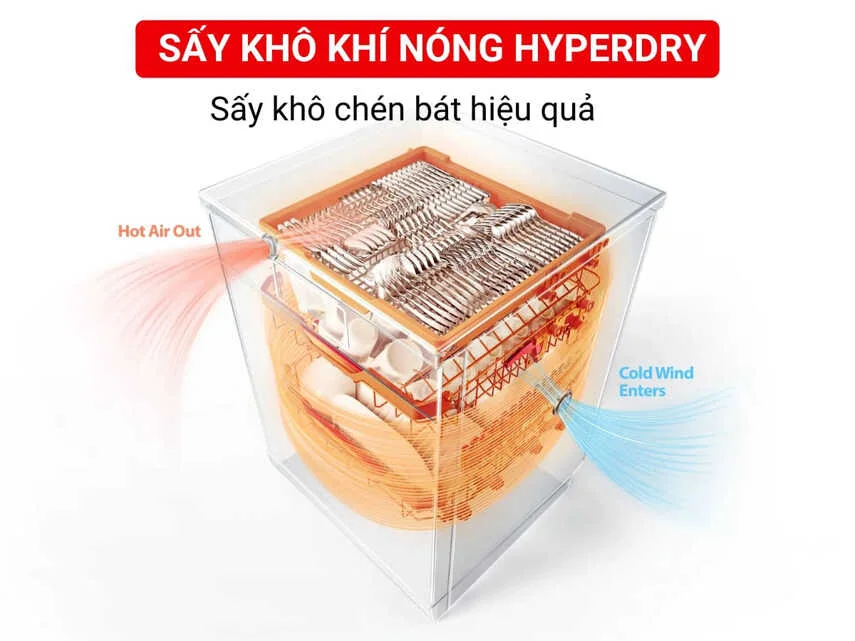 – Công nghệ sấy khí nóng HyperDry giúp loại bỏ hơi ẩm triệt để sau mỗi chu trình rửa. Luồng khí nóng được tuần hoàn liên tục, giúp sấy khô nhanh, đều và giữ cho chén bát luôn sáng bóng, không đọng nước. Nhờ đó, máy không chỉ đảm bảo hiệu quả làm khô vượt trội trong thời gian ngắn mà còn hạn chế vi khuẩn và mùi ẩm, mang lại sự tiện nghi tối ưu.