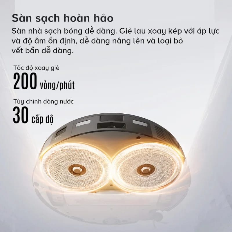 Đặc biệt, robot được trang bị tấm lau rung sonic với tần số 3000 lần/phút, giúp làm sạch hiệu quả các vết bẩn cứng đầu mà không cần sử dụng nhiều nước. Thiết kế tấm lau áp lực không đổi giúp duy trì lực ép phù hợp lên bề mặt sàn, đảm bảo hiệu quả làm sạch đồng đều trên toàn bộ khu vực.