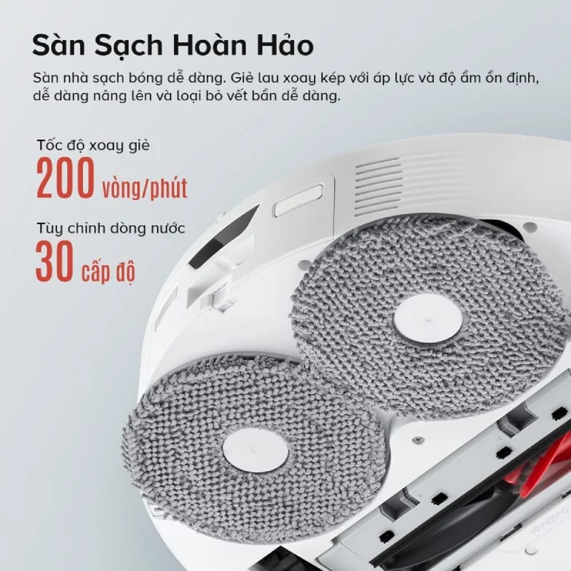 Bộ phận lau được thiết kế với hai miếng lau microfiber xoay với tốc độ 200 vòng/phút, tạo áp lực mạnh mẽ lên bề mặt sàn để loại bỏ mọi vết bẩn. Áp lực này còn được tăng cường nhờ hệ thống nâng tự động, giúp miếng lau áp sát vào sàn với lực không đổi.