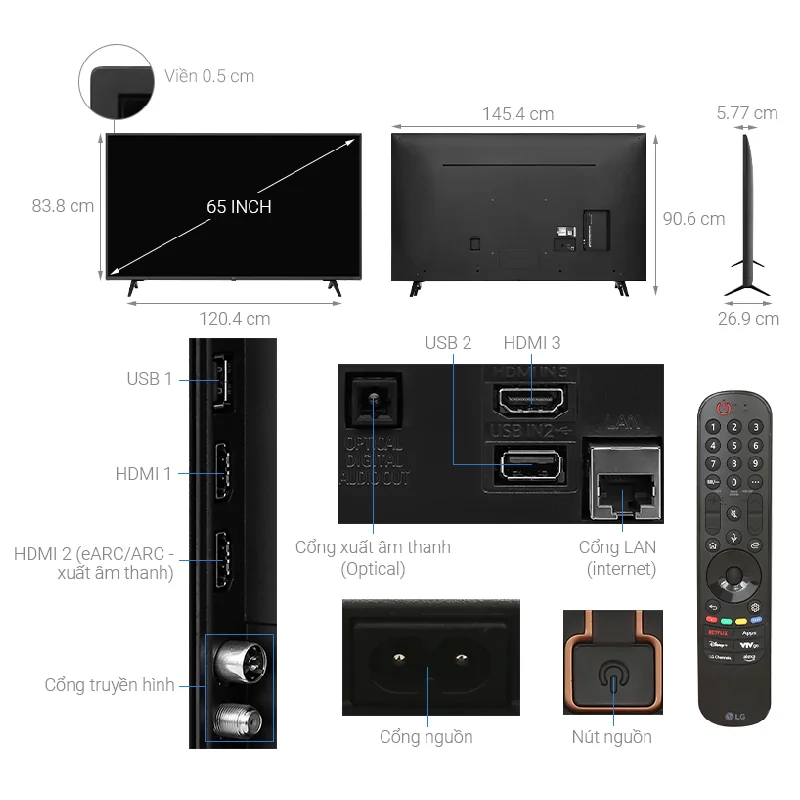 Thiết kế 65 inch, viền mỏng hiện đại của Smart Tivi LG 65 Inch 4K 65UT8050PSB, phù hợp với mọi không gian sống.