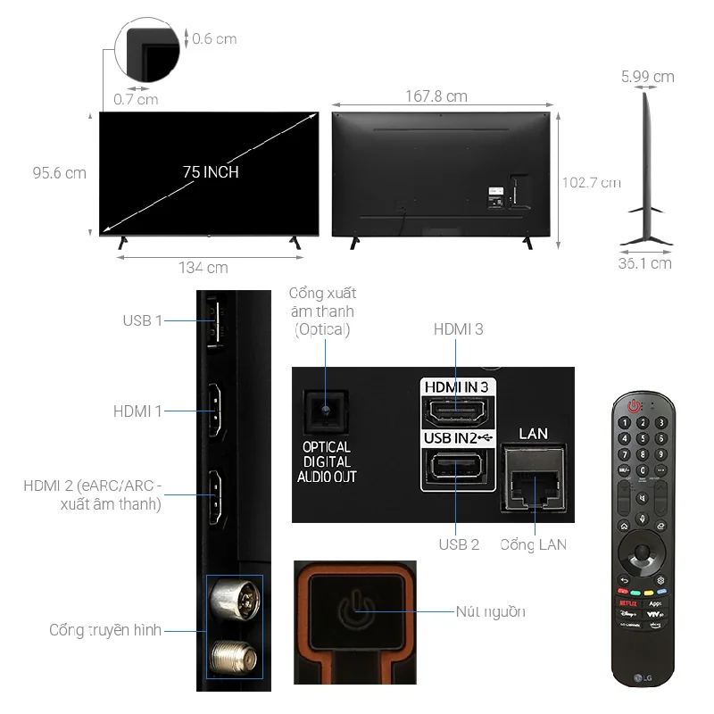 Smart Tivi LG 75 inch 4K – 75UT8050PSB không chỉ sở hữu thiết kế đẹp mắt mà còn đi kèm nhiều tiện ích kết nối thông minh, mang đến trải nghiệm giải trí mượt mà và tiện lợi: