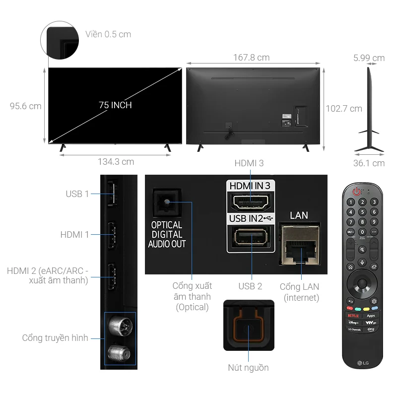 Ngay từ cái nhìn đầu tiên, Smart Tivi LG 75UT8050PSB đã gây ấn tượng mạnh với màn hình khổng lồ 75 inch cùng thiết kế tinh tế, phù hợp với mọi phong cách nội thất. Viền siêu mỏng tạo cảm giác hình ảnh tràn viền, mang đến trải nghiệm đắm chìm hoàn toàn trong không gian giải trí.