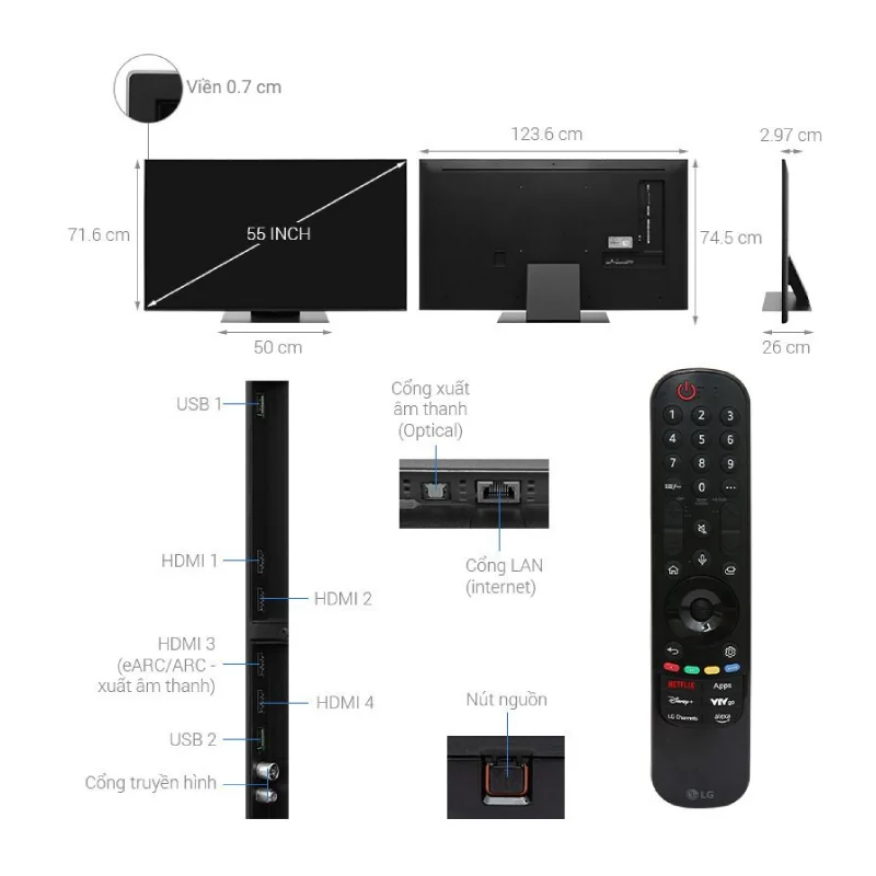 Sở hữu kích thước màn hình 55 inch, chiếc tivi LG này lý tưởng cho những không gian rộng như phòng khách, phòng giải trí hay phòng đọc sách.