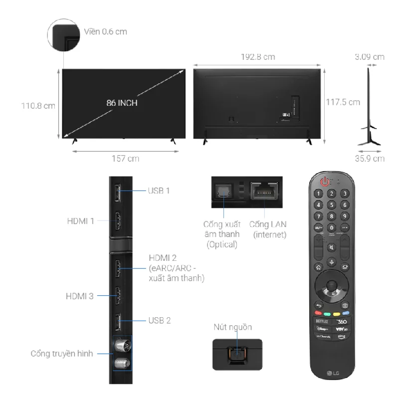 Smart Tivi LG sở hữu màn hình lớn 86 inch, thiết kế với phần góc cạnh vuông vức, cứng cáp và màu đen lịch lãm, góp phần tạo điểm nhấn cho không gian nội thất trở nên hiện đại và cao cấp hơn.