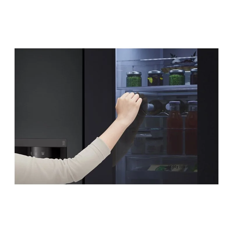 Điểm đặc biệt nhất trong thiết kế của LG GR-X257BL chính là cửa kính InstaView Door-in-Door. Chỉ với hai lần gõ nhẹ, người dùng có thể nhìn thấy bên trong tủ mà không cần mở cửa. Điều này không chỉ mang lại sự tiện lợi mà còn giúp hạn chế thất thoát hơi lạnh, bảo vệ thực phẩm tốt hơn. Cánh cửa này còn có khả năng lưu trữ các loại đồ uống, gia vị thường dùng, giúp người dùng dễ dàng lấy nhanh mà không ảnh hưởng đến nhiệt độ bên trong tủ.