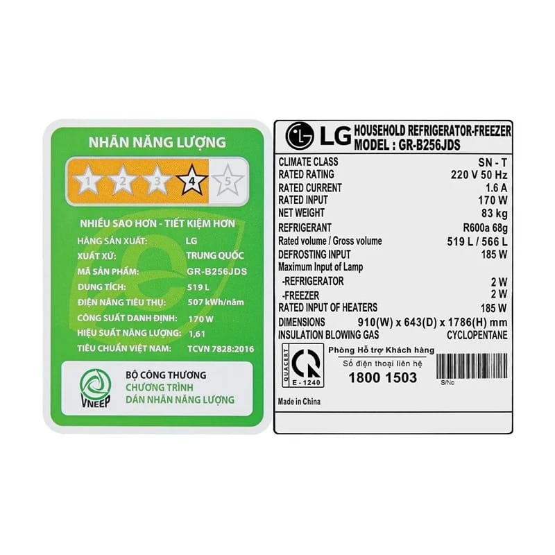 Sản phẩm đạt chuẩn tiết kiệm năng lượng 5 sao, mức cao nhất hiện nay. Với công suất tiêu thụ chỉ khoảng 507 kWh/năm, tủ lạnh LG GR-B256JDS giúp gia đình tiết kiệm đáng kể chi phí điện năng hàng tháng, đặc biệt phù hợp cho việc sử dụng lâu dài.