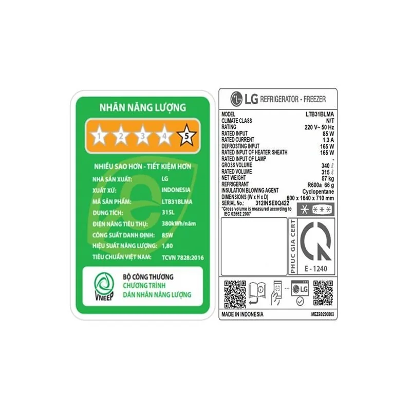 Theo thông số kỹ thuật từ nhà sản xuất, tủ lạnh LG Inverter 315 Lít LTB31BLMA có mức tiêu thụ điện năng chỉ khoảng 1.04 kWh/ngày, tương đương với khoảng 325 kWh/năm. Con số này thấp hơn đáng kể so với các dòng tủ lạnh thông thường cùng dung tích, giúp người dùng tiết kiệm chi phí điện năng hàng tháng.