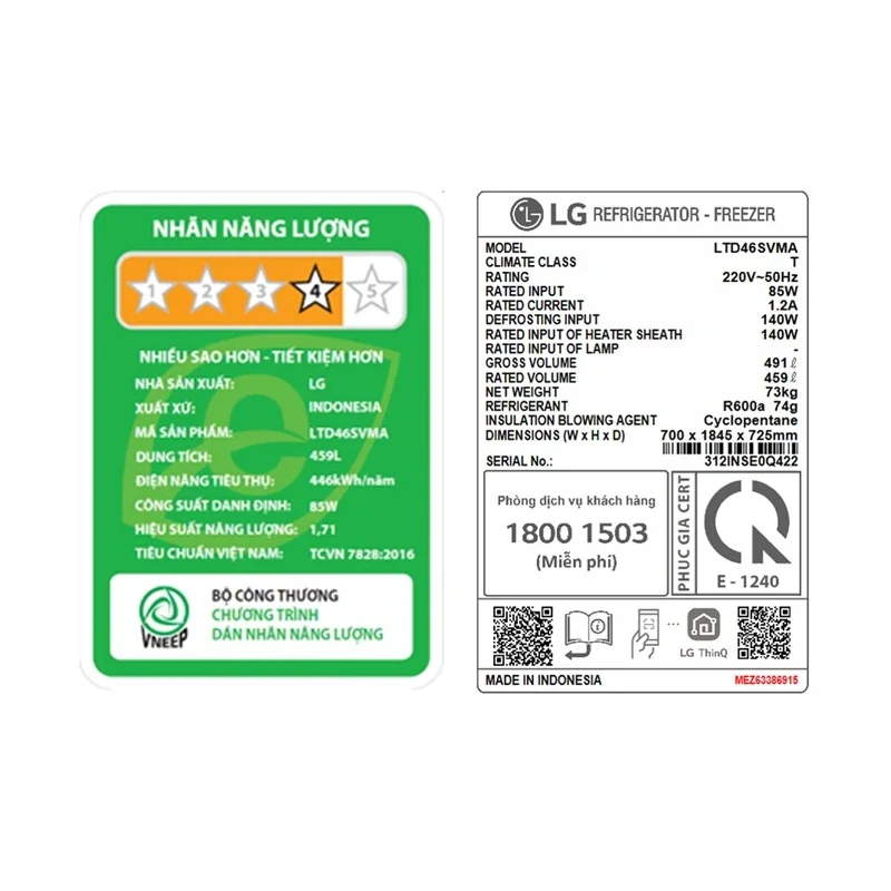 Nhờ đó, tủ lạnh Inverter tiết kiệm điện đáng kể, giảm tiếng ồn và tăng tuổi thọ của máy nén. Theo thông số từ nhà sản xuất, tủ lạnh LG Inverter 459 lít LTD46SVMA có mức tiêu thụ điện khoảng 1.29 kWh/ngày, giúp giảm áp lực về chi phí điện năng hàng tháng cho gia đình.