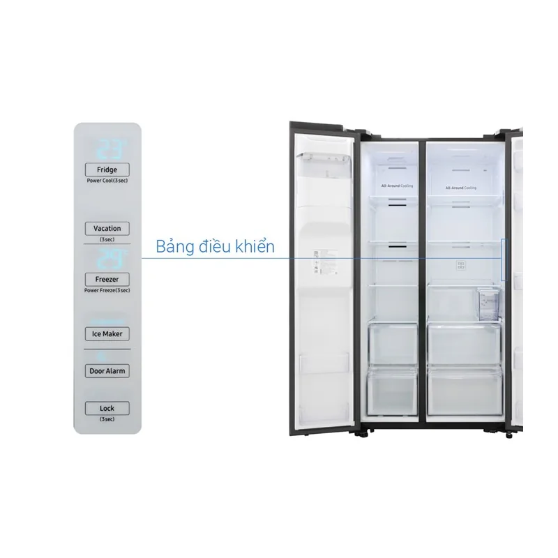 Tủ lạnh Samsung Side By Side RS64R53012C/SV được trang bị công nghệ All-around Cooling với các cửa thổi khí lạnh được bố trí khoa học ở mỗi tầng kệ. Hệ thống này đảm bảo không khí lạnh được luân chuyển đều khắp các ngăn của tủ, từ trên xuống dưới, từ trong ra ngoài, giúp duy trì nhiệt độ ổn định ở mọi vị trí.